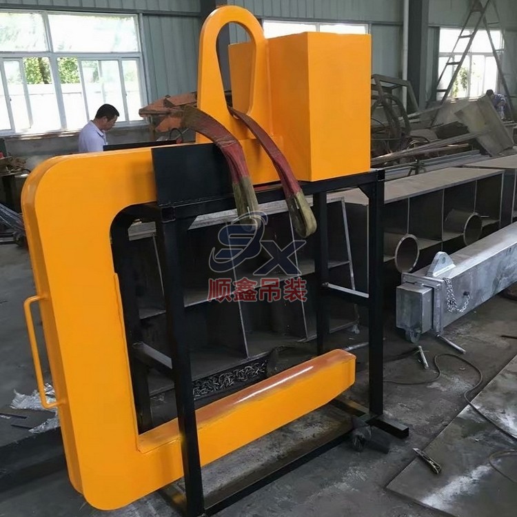 C型吊具適用于鋼卷的水平吊運(yùn),由吊具體和配重鐵組成。主體部分由合金鋼和鋼管拼接而成,截面為箱型結(jié)構(gòu),配重鐵起調(diào)節(jié)吊具平衡的作用,使吊具和被吊物的重心在一條線內(nèi)。載荷范圍:3.2-32噸。